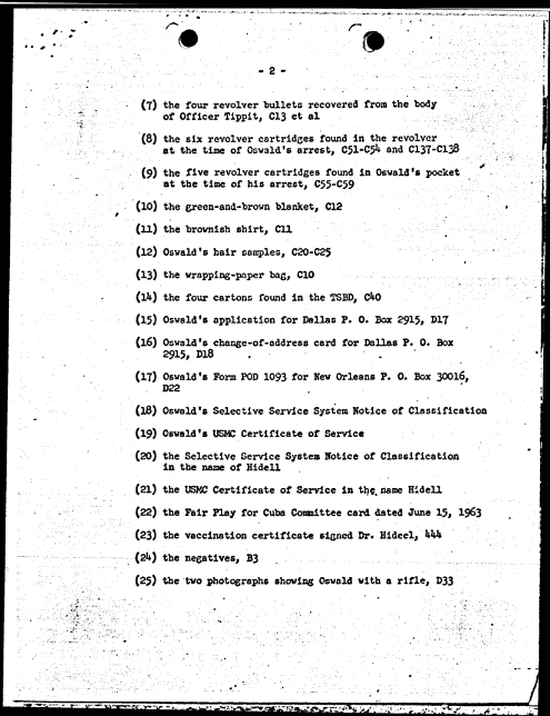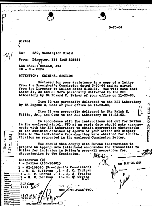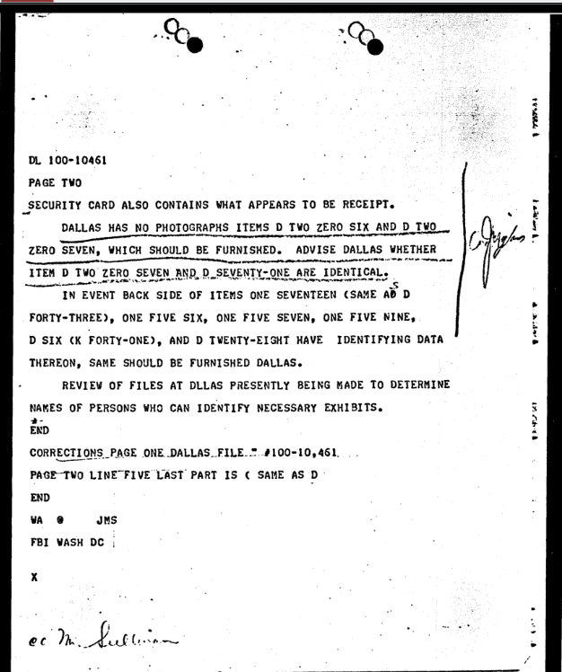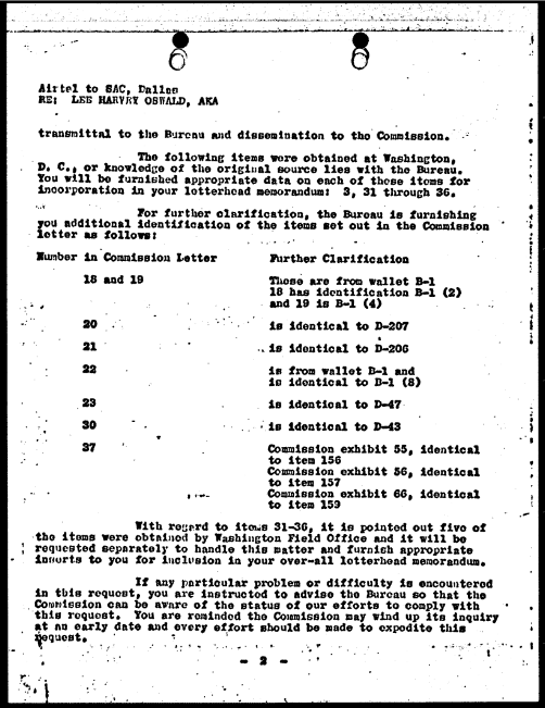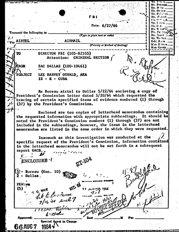 On June 2, 1964, FBI Headquarters sent the requested items to Dallas. This was documented in a transmittal airtel and a property invoice sheet.[8][9]