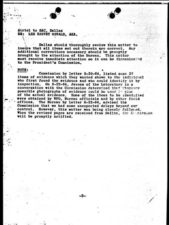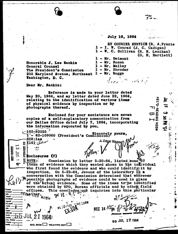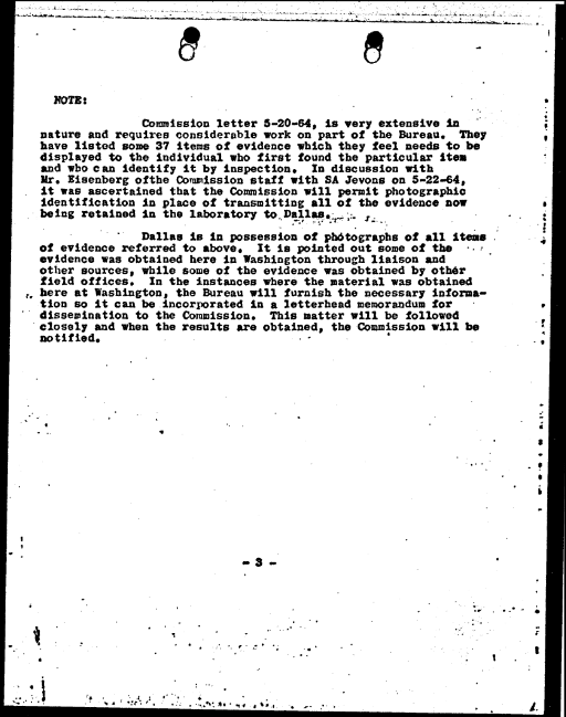 On May 22, 1964, FBI Headquarters forwarded Rankin’s letter to Dallas along with an airtel containing a list of instructions. According to this airtel, Special Agent Jevons of the FBI Lab had spoken to Commission counsel Melvin Eisenberg and convinced him that it would be sufficient to display photographs instead of the original items of evidence “wherever possible”.[4]
