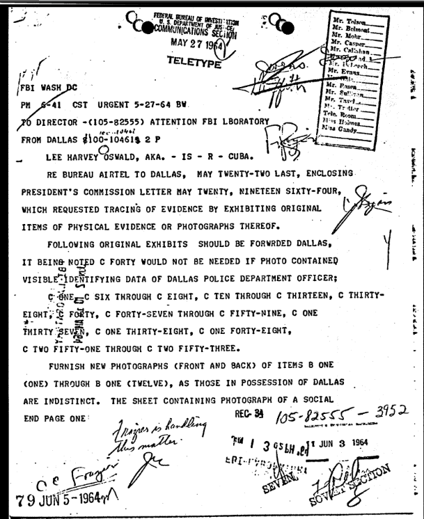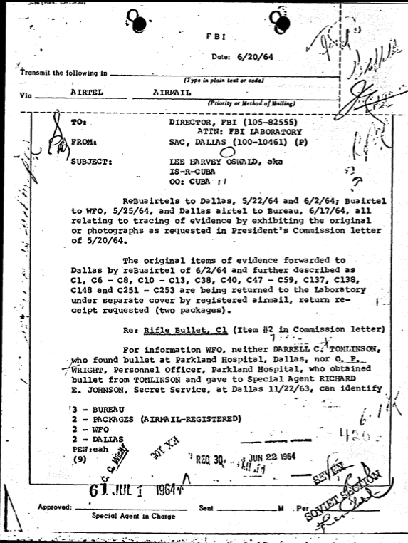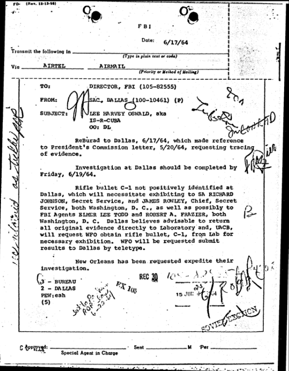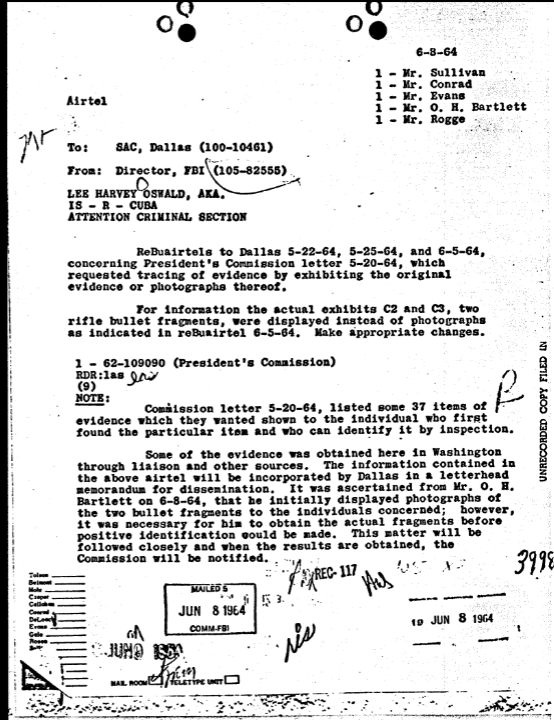 On June 5, 1964, FBI Headquarters sent an airtel to Dallas containing their inserts for the final letterhead memorandum. The items handled by FBI Headquarters included the rifle bullet fragments discovered in the Presidential limousine and a letter Oswald sent to the ACLU.[11]