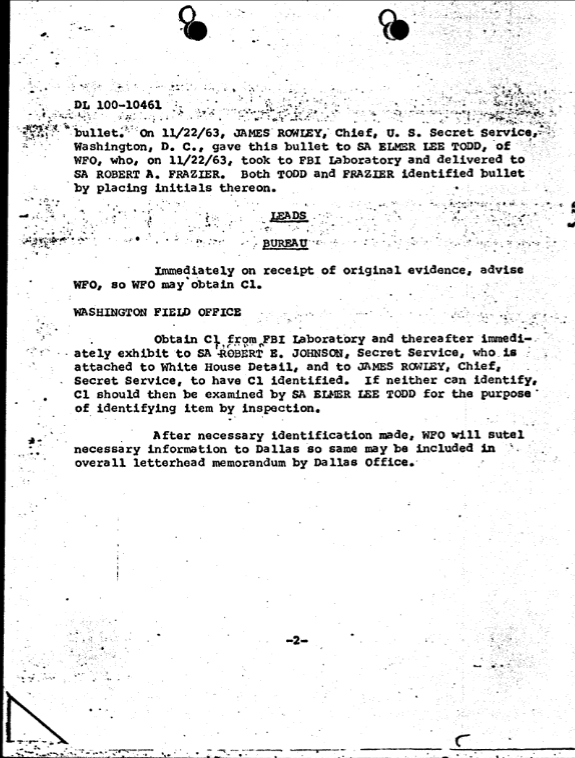 On June 20, 1964, Dallas sent a follow-up airtel stating that they were returning all the original evidence to the FBI Lab. The airtel instructed the Washington Field Office to obtain the rifle bullet and display it to Richard Johnsen and James Rowley. If they failed to identify it, the bullet was to be shown to Elmer Lee Todd. The airtel also included additional details about the failed identifications in Dallas: neither Darrell Tomlinson nor O.P. Wright could identify the bullet.[16]