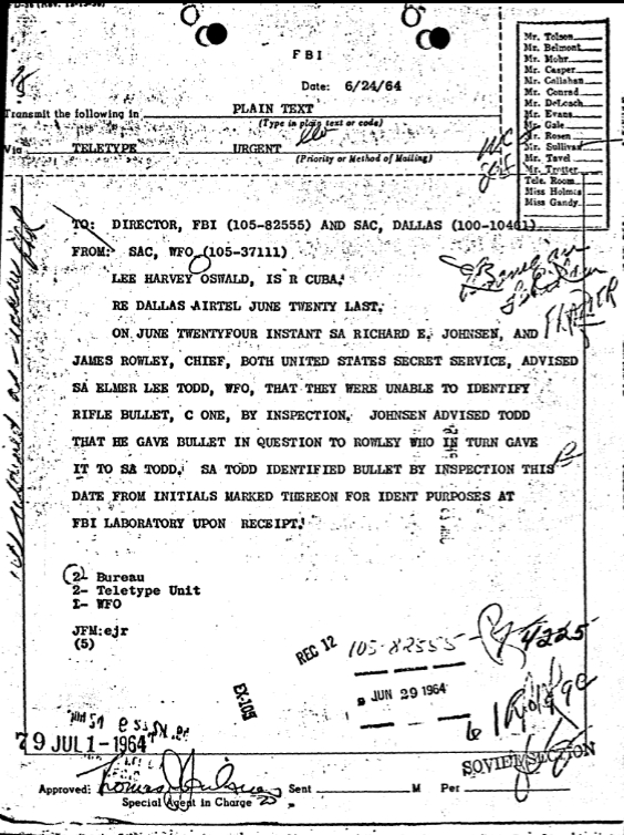 On June 24, 1964, the Washington Field Office sent a teletype to FBI Headquarters and Dallas stating that neither Richard Johnsen nor James Rowley could identify the bullet by inspection. However, Elmer Lee Todd was able to identify the bullet based on the initials he had marked on it before turning it over to the FBI Lab.[21]