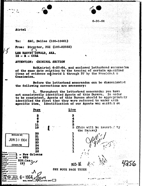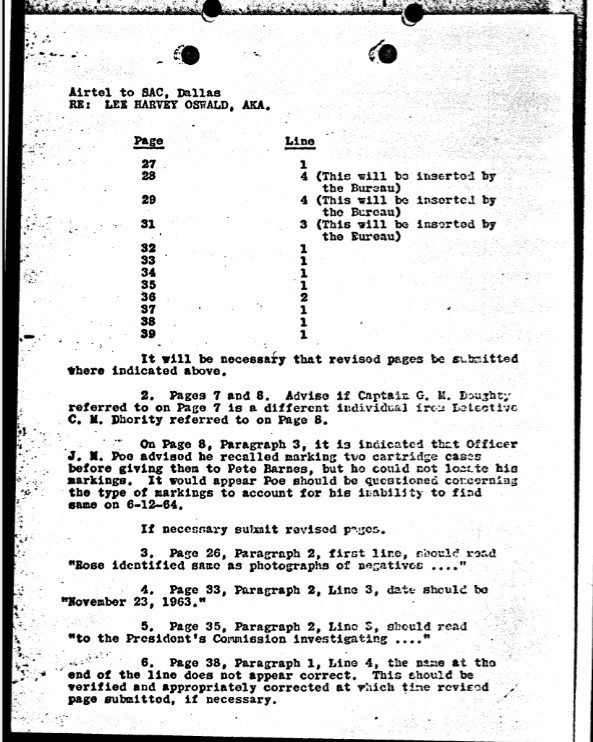 On June 30, 1964, FBI Headquarters sent an airtel to Dallas instructing them to revise the submitted letterhead memorandum. According to this airtel, Dallas had failed to identify the agents who conducted several of the interviews reported in the first draft of CE2011.[23]