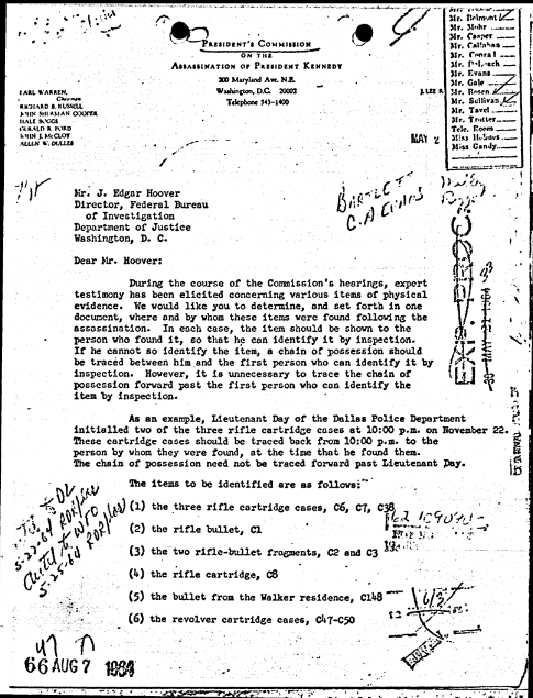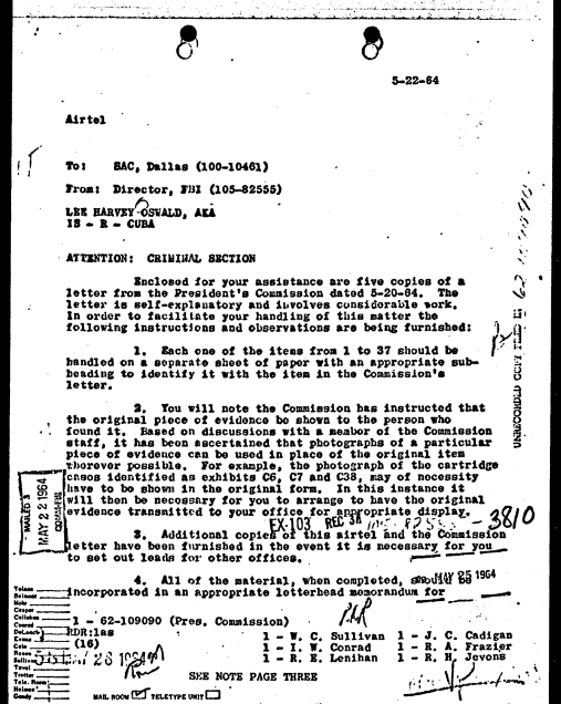 On May 22, 1964, FBI Headquarters forwarded Rankin’s letter to Dallas along with an airtel containing a list of instructions. According to this airtel, Special Agent Jevons of the FBI Lab had spoken to Commission counsel Melvin Eisenberg and convinced him that it would be sufficient to display photographs instead of the original items of evidence “wherever possible”.[4]
