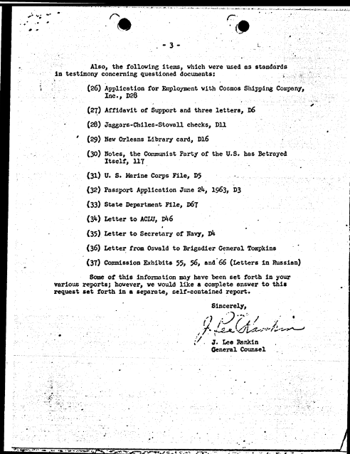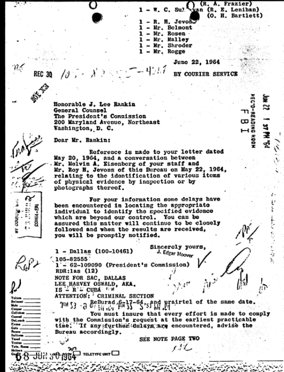 That same day, FBI Headquarters sent a letter to J. Lee Rankin stating: