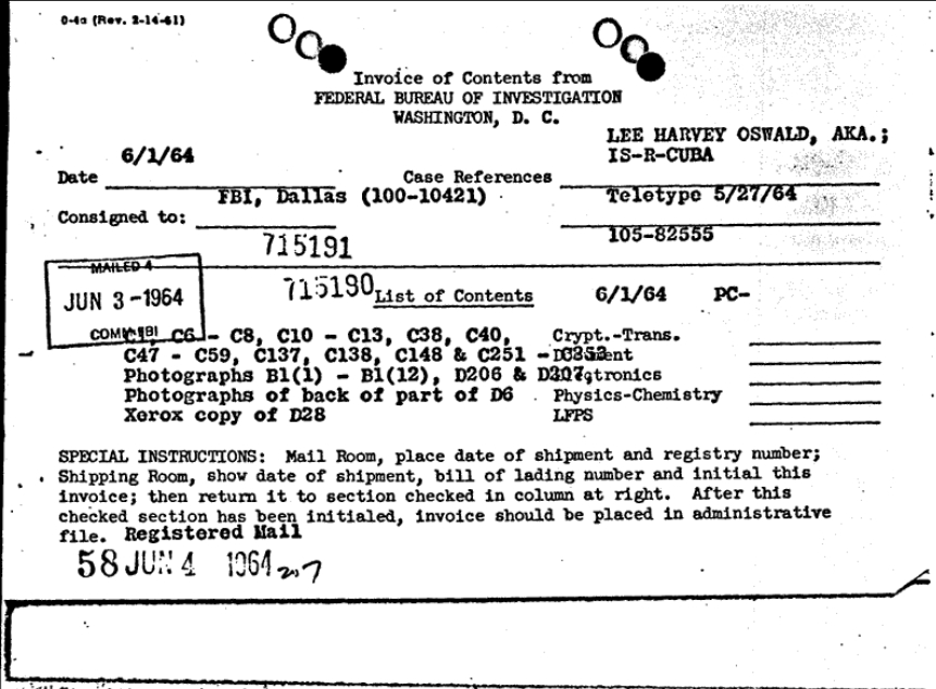 On June 2, 1964, FBI Headquarters sent the requested items to Dallas. This was documented in a transmittal airtel and a property invoice sheet.[8][9]