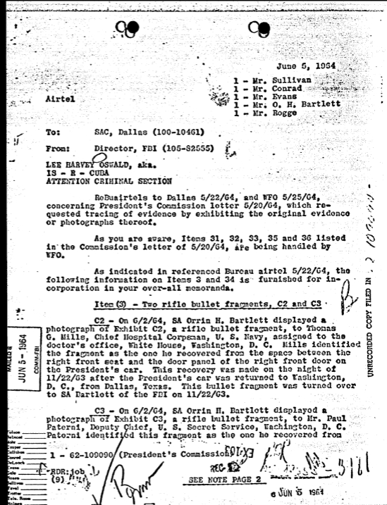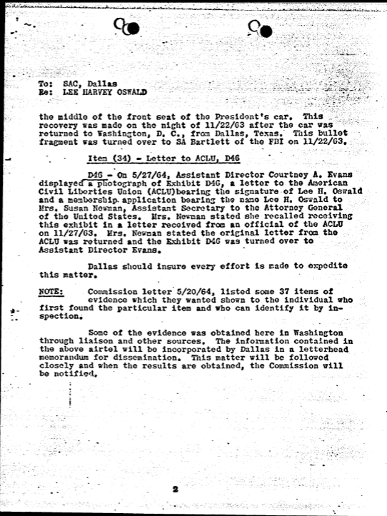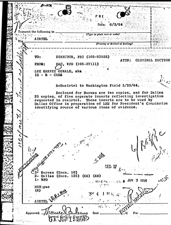 On June 5, 1964, FBI Headquarters sent an airtel to Dallas containing their inserts for the final letterhead memorandum. The items handled by FBI Headquarters included the rifle bullet fragments discovered in the Presidential limousine and a letter Oswald sent to the ACLU.[11]