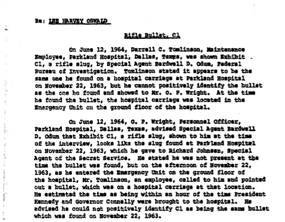 Notably, this airtel makes no mention of Tomlinson and Wright’s alleged statements that the bullet resembled the one they found. Given that the report’s focus was on obtaining a full positive identification, the omission of such a detail is not necessarily suspicious. However, it has been suggested that the FBI may have embellished Tomlinson and Wright’s statements to align more closely with the official narrative. This claim stems from an interview Josiah Thompson conducted with Wright in 1966, during which Wright stated that the bullet discovered by Tomlinson did not resemble CE399 and that it had a pointed tip.[17] While it is certainly possible that the FBI adjusted Tomlinson and Wright’s statements to make them more consistent with the official story, without direct evidence of such a revision, this remains speculative.